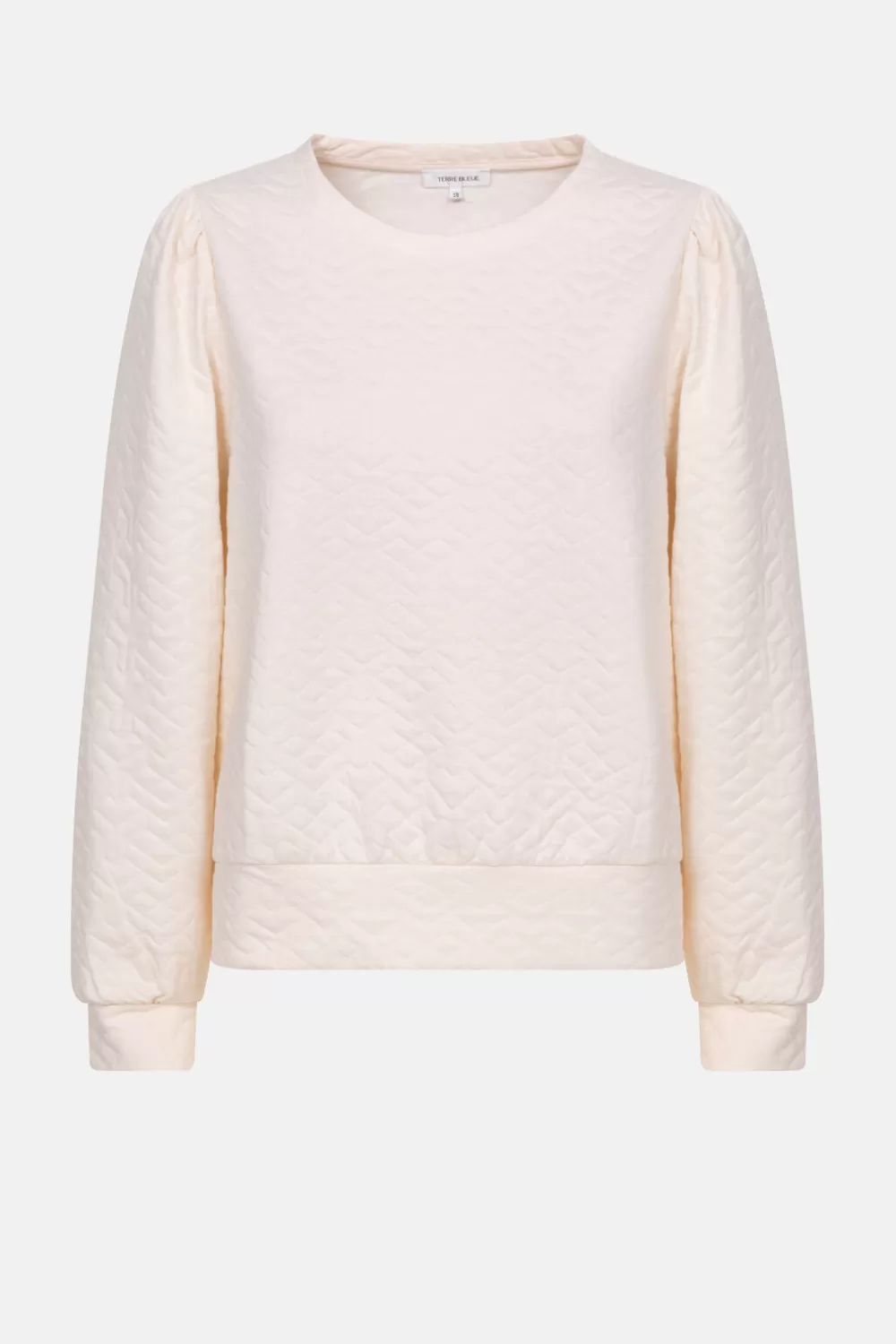 Ecru Damespull Met Een Gestikt Geometrisch Motief.Een Sportieve, Korte Snit Met Lange Pofmouwen.Casual En Chic Met Een B…