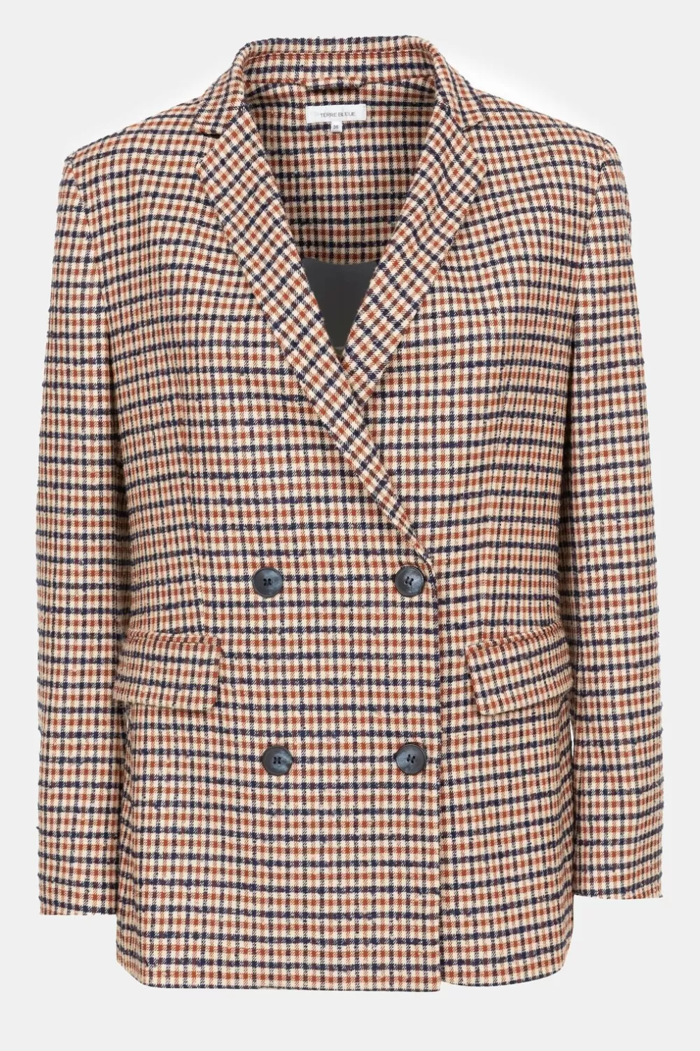 Bruin Geruite Damesblazer Met Blauwe Voering.Een Korte Double-Breasted Snit Met Fijne Col Revers.Mooi Met Een Geruite Br…