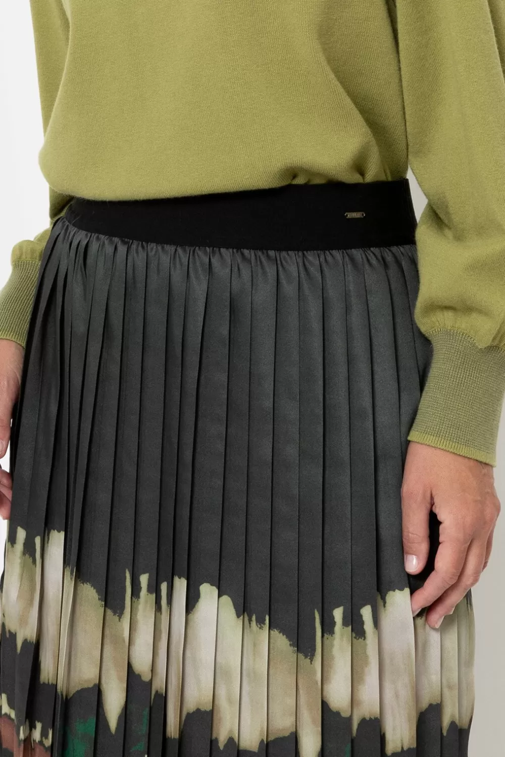 Donker Kaki Plisse Rok In Subtiel Glanzende Stof.Losse Snit Met Fijne Plooitjes En Een Taille-Elastiek.Met Lichtgroene E…