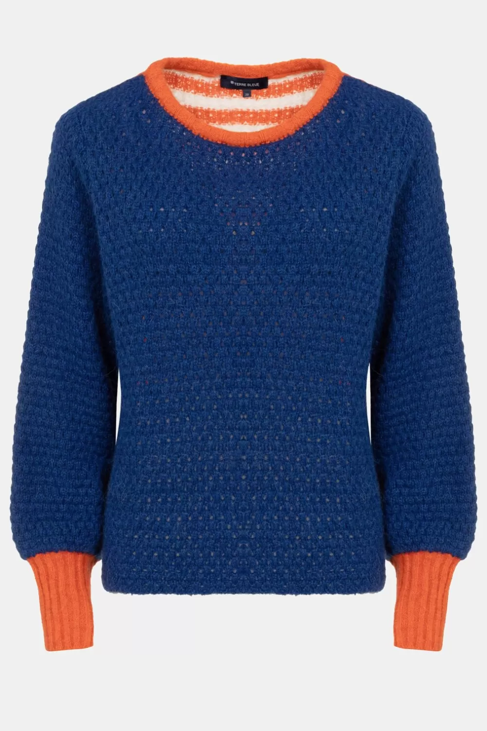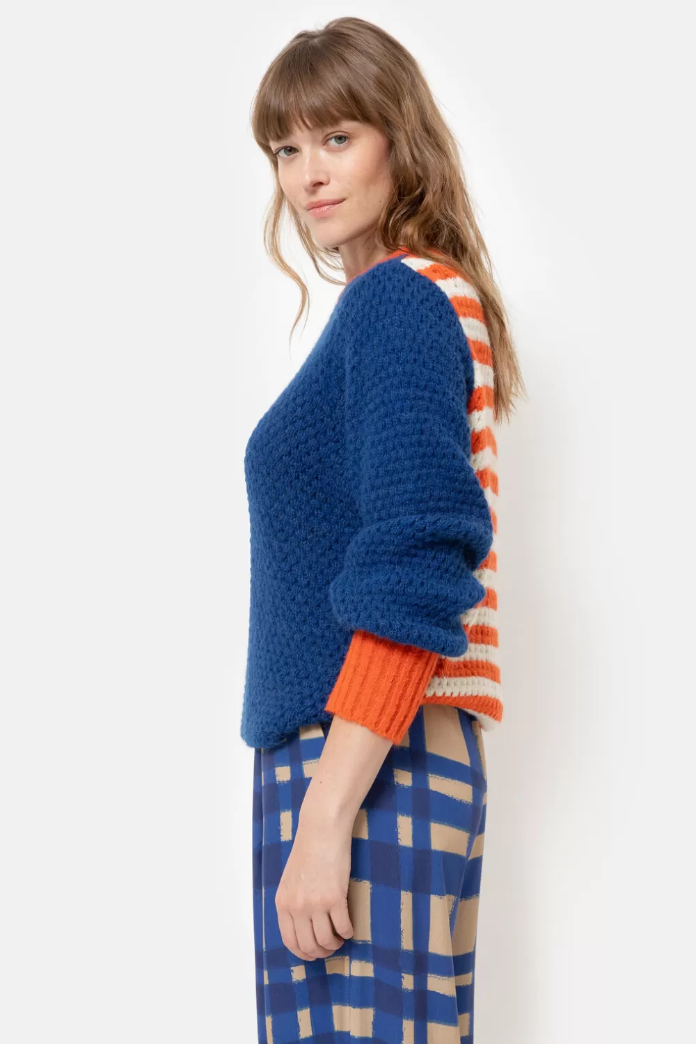 Donkerblauwe Gebreide Trui Met Chique Boothals.Het Voorpand Is Blauw, De Rug Ecru-Oranje Gestreept.Een Korte, Wat Losser…