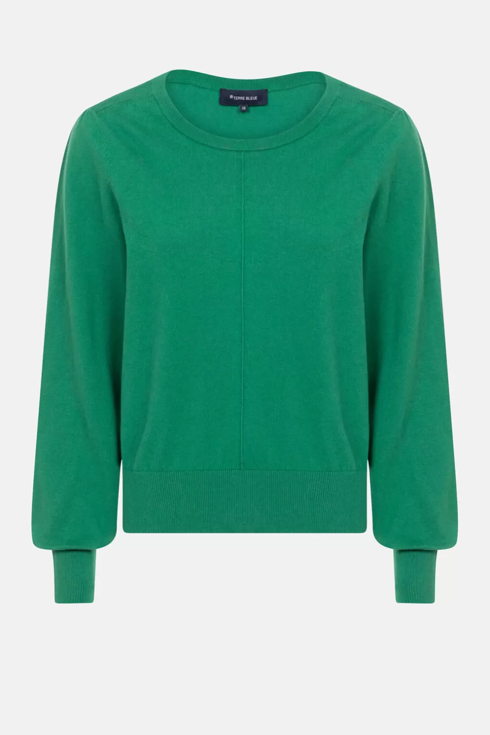 Groene Damestrui In Fijn Tricot Van O.A. Katoen.Een Korte Snit Met Elegante Lange Pofmouwen.Een Boothals En Jacquard Str…