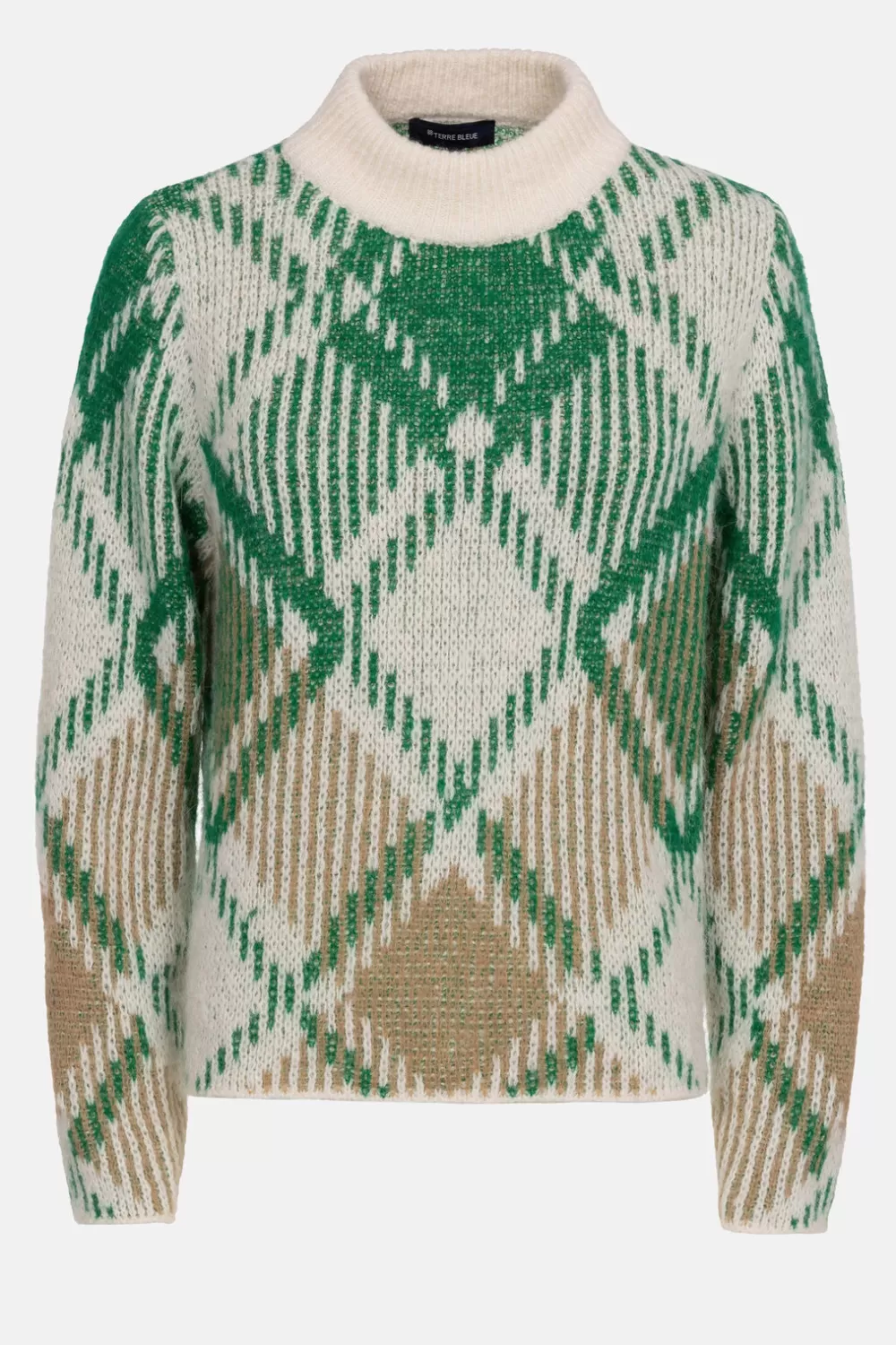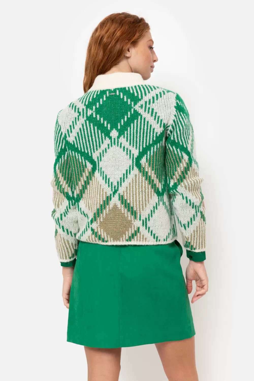 Beige Gebreide Dames Sweater Met Groene Ruiten.Een Elegante Korte Snit Met Een Opstaande Kraag.Match Sportief En Chic Me…