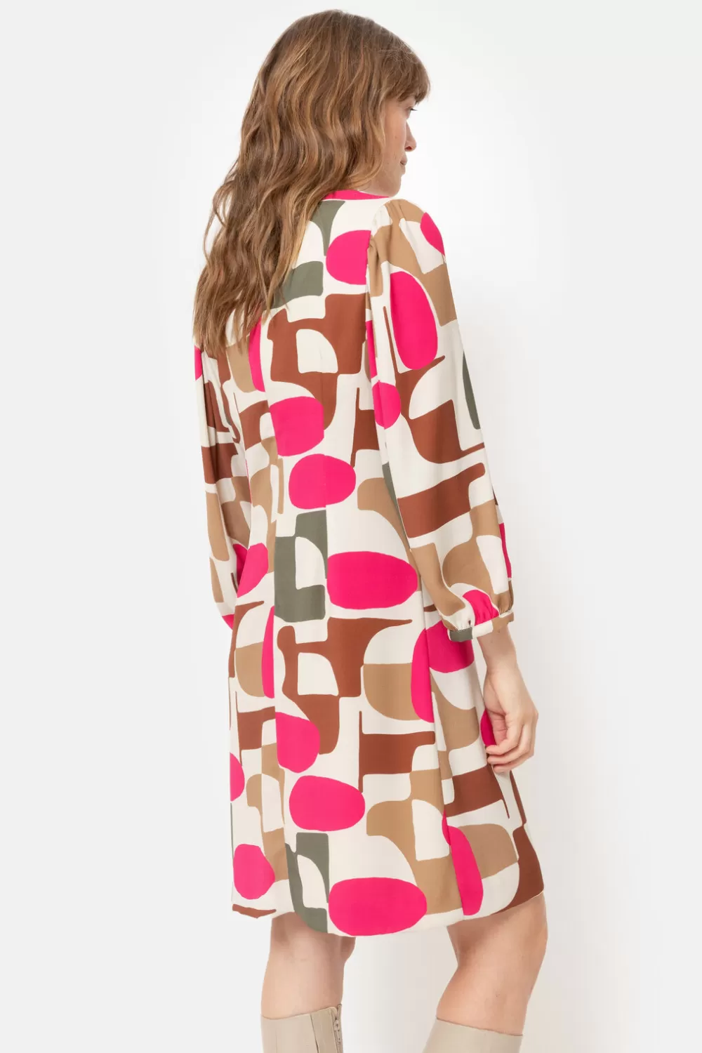 Beige Dames Kleedje In O.A. Gerecycled Polyester.Een Korte A-Lijn Met Chique 7/8 Pofmouwen.Een Vrouwelijke V-Hals En Ing…