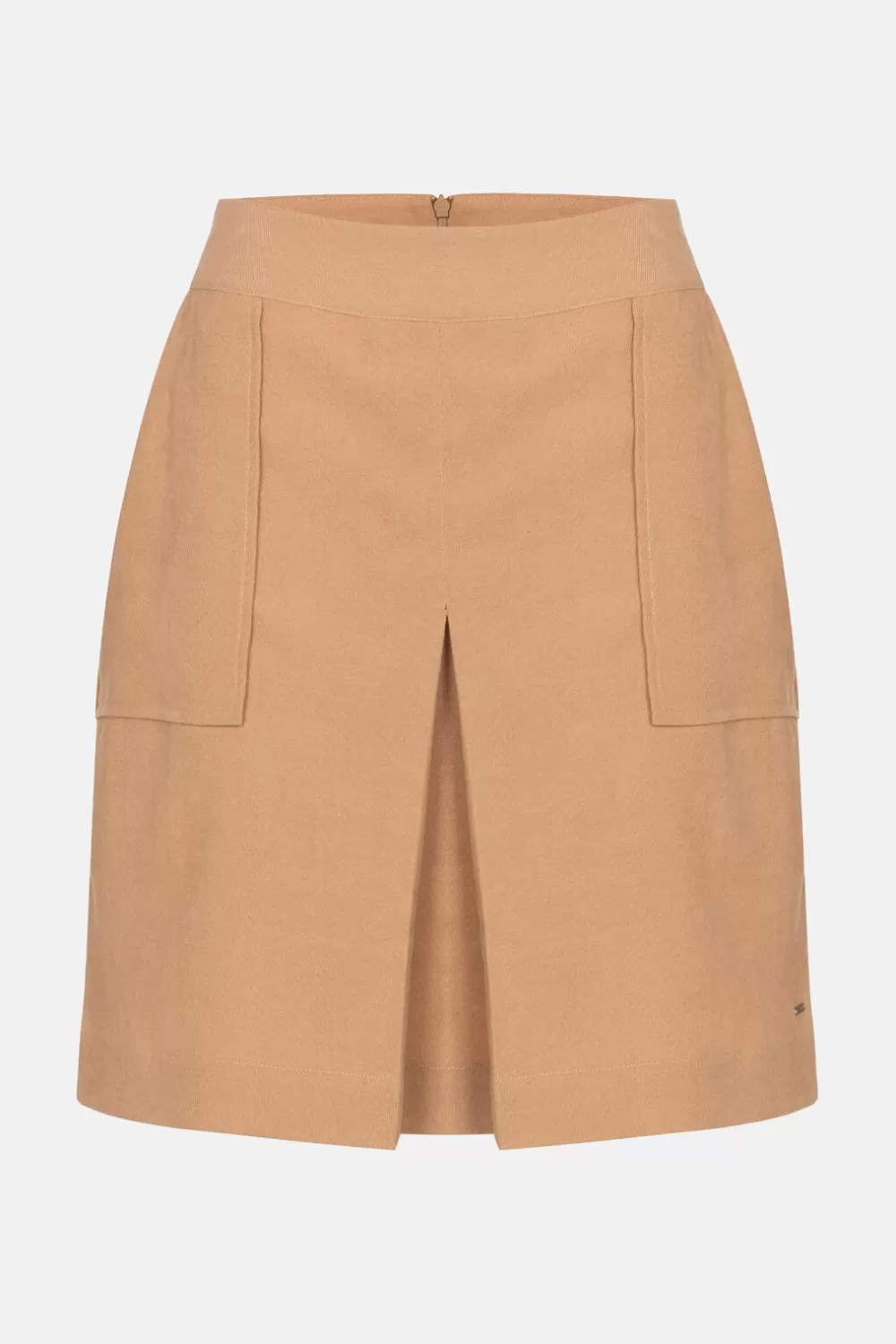 Donkerbeige Korte Dames Rok In Fijn Fluweel.Met Een Valse Split En Xl Opzetzakken Vooraan.Casual En Chic Met Een Beige G…