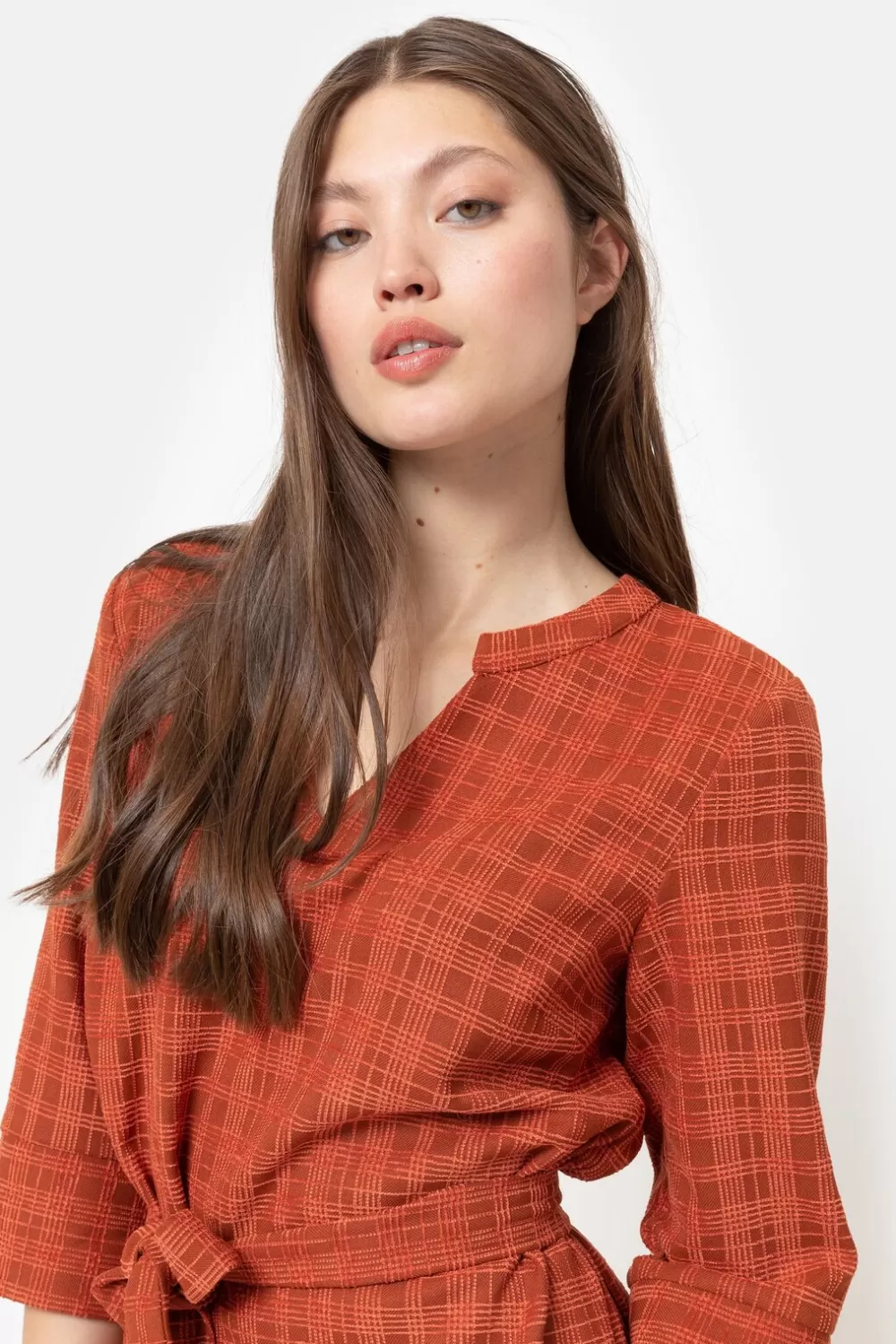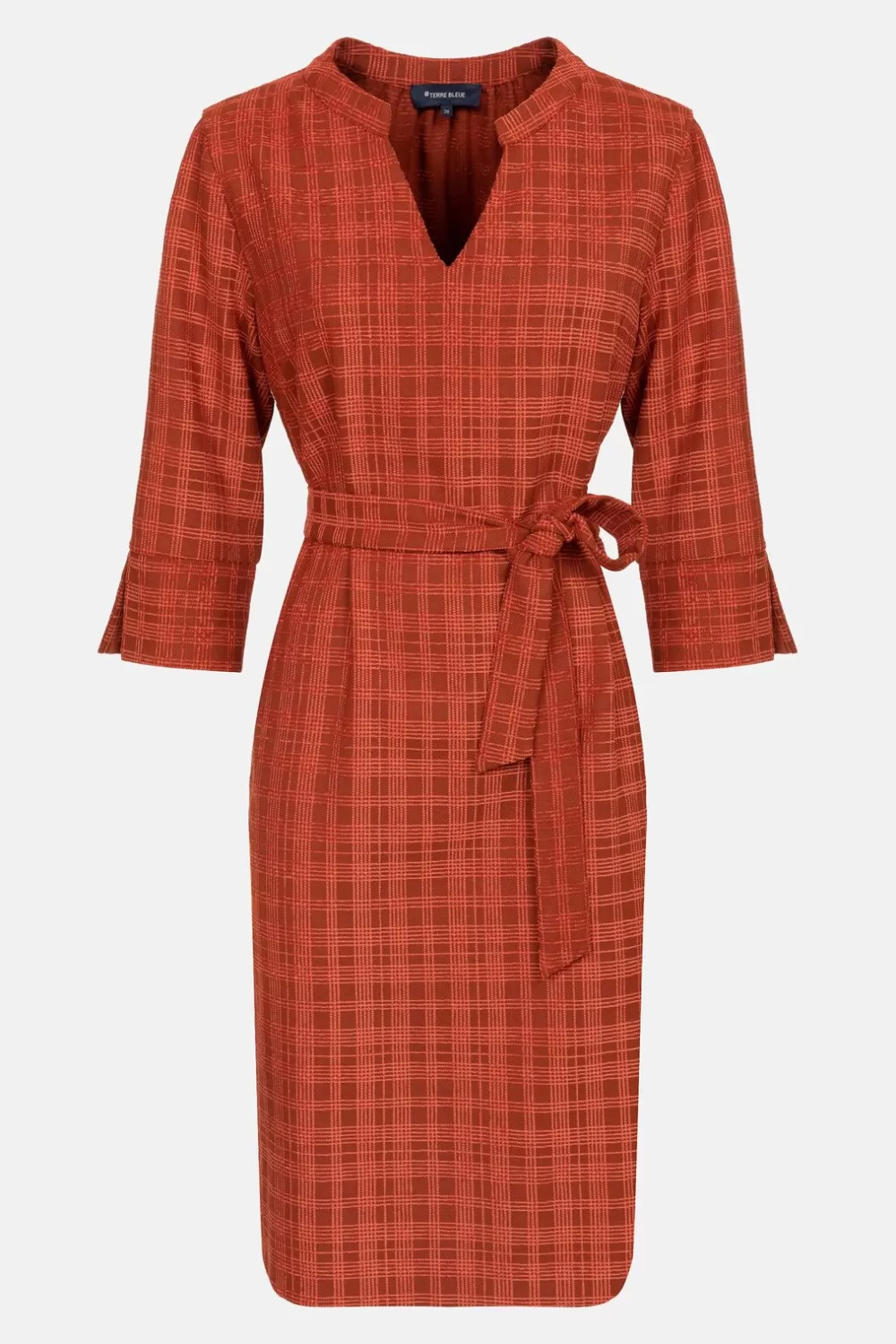 Oranje-Bruin Geruit Kleedje Tot Aan De Knie.Een Losse Snit Met Een Elegante V-Hals En Taillelint.En 3/4 Mouwen Met Manch…
