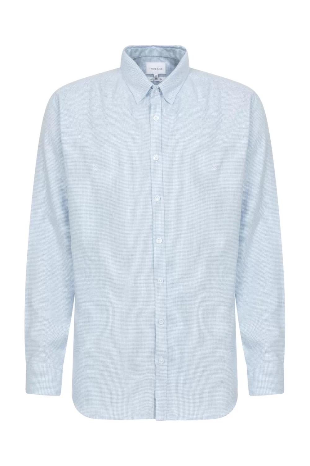 Lichtblauw Geruit Flanellen Hemd Van 100% Katoen. Een Geklede Slim Fit In Een Zeer Zachte, Fijne Stof.Met Fijne Witte Kn…