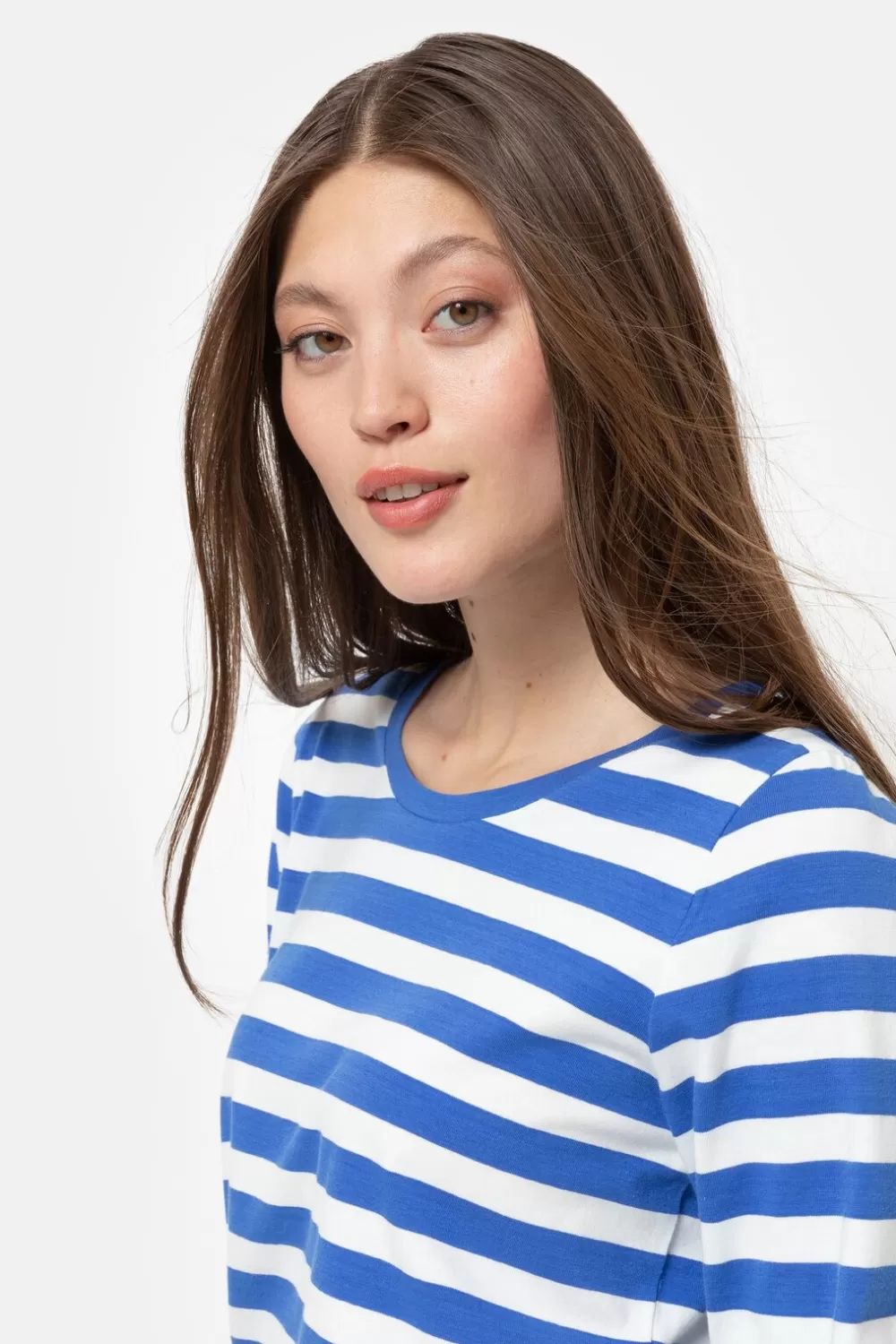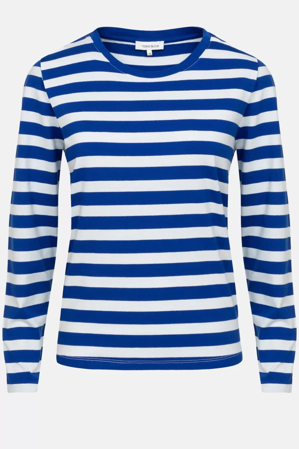 Ecru-Blauw Gestreepte Top In Katoen Met Stretch.Een Vrouwelijke, Korte Fit Met Lange Mouwen.Trendy Onder Een Blauwe Jurk…