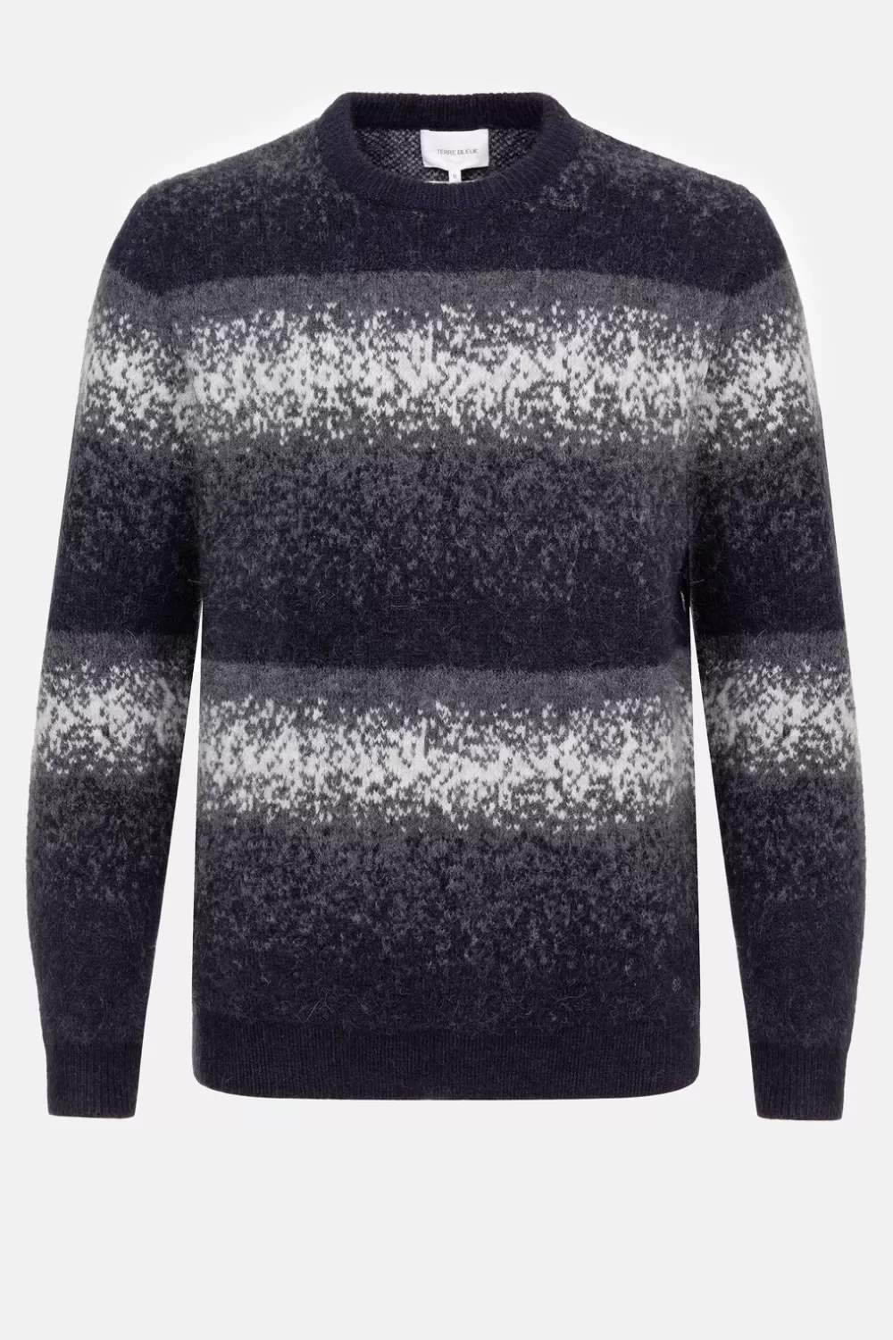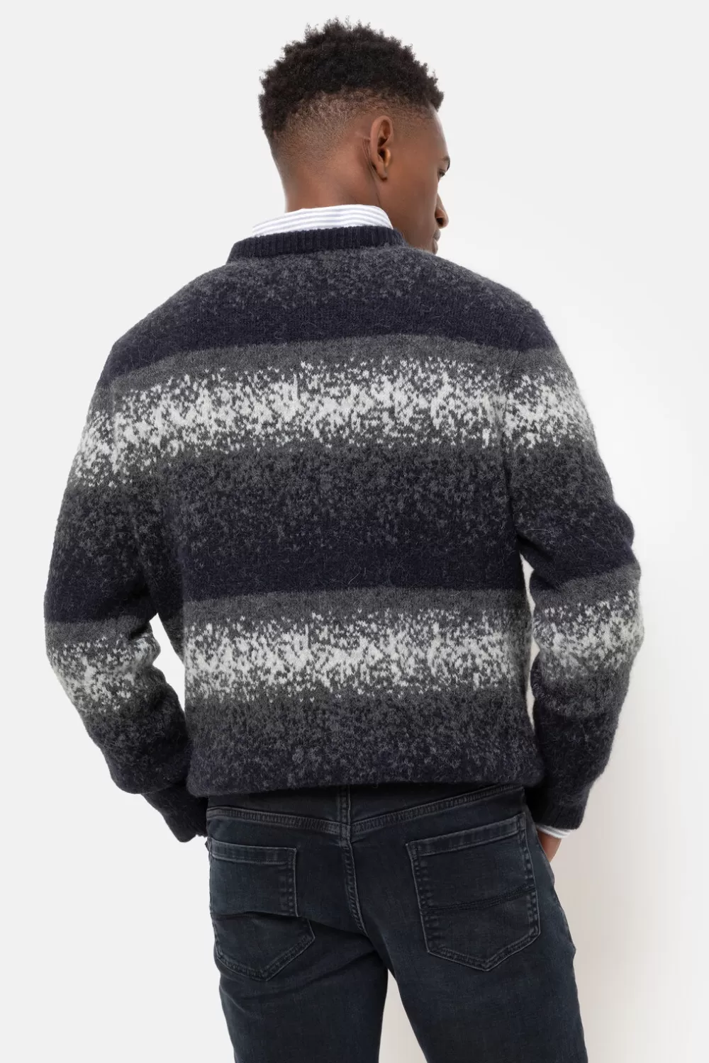 Warme Herentrui Met Grijze En Blauwe Strepen.Een Korte, Elastische Knit Die Comfortabel Zit.Met Een Ronde Hals, Elastiek…