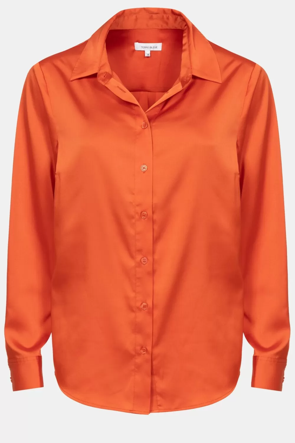 Oranje Damesblouse In Een Soepele Glansstof.Met Een Klassieke Hemdkraag En Oranje Knoopjes.Mooi Met Een Oranjebruine Rok…