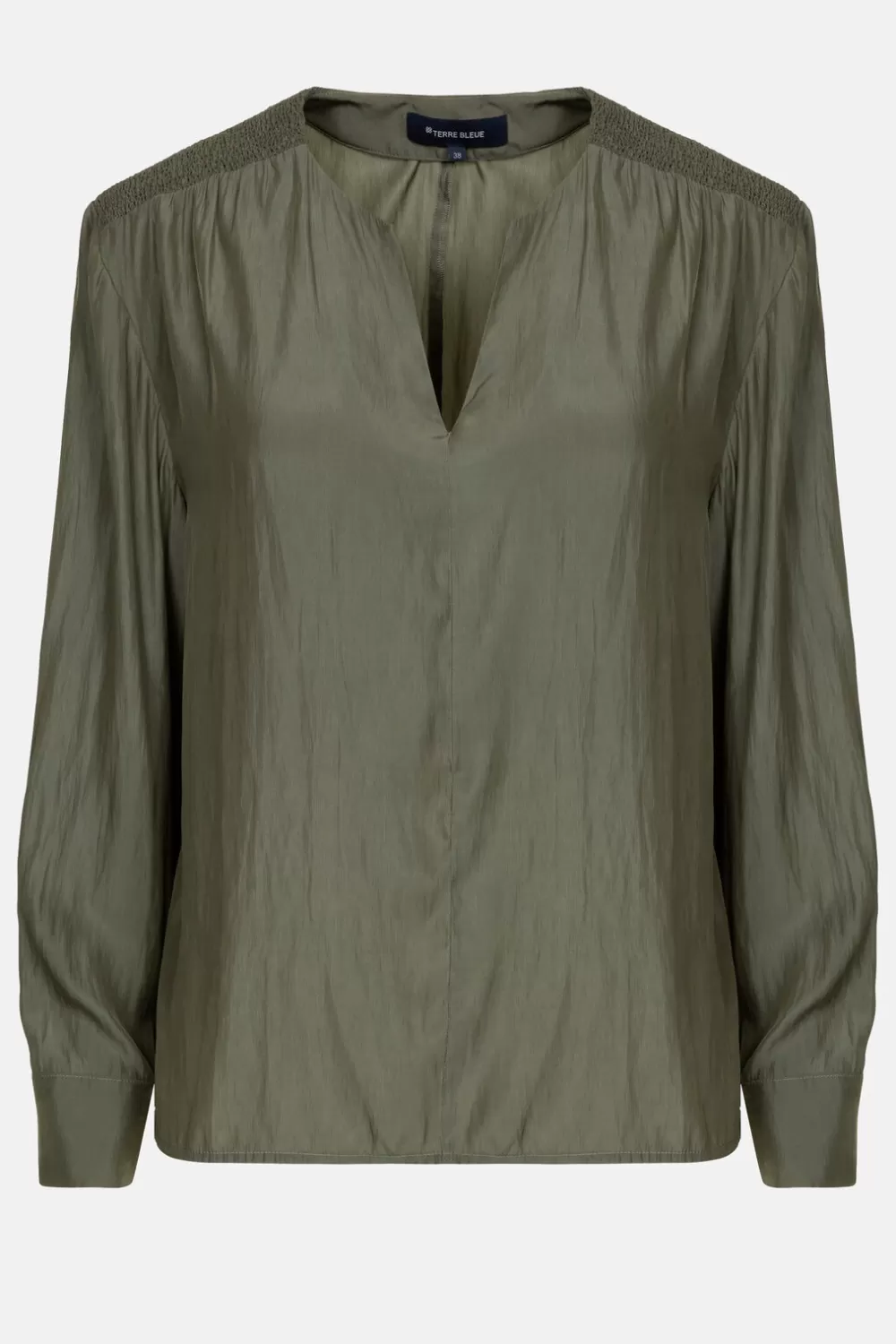 Kakigroene Blouse In Een Fijne, Soepelvallende Stof.Met Smock Op De Schouders En Elegante Manchetten.En Een Ronde Hals M…