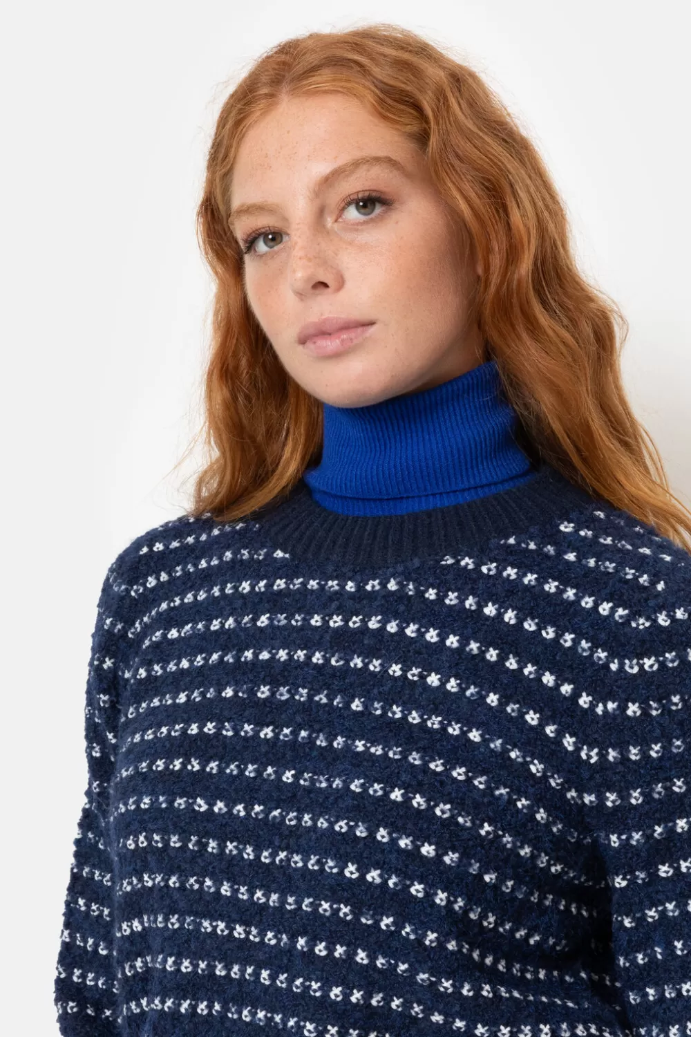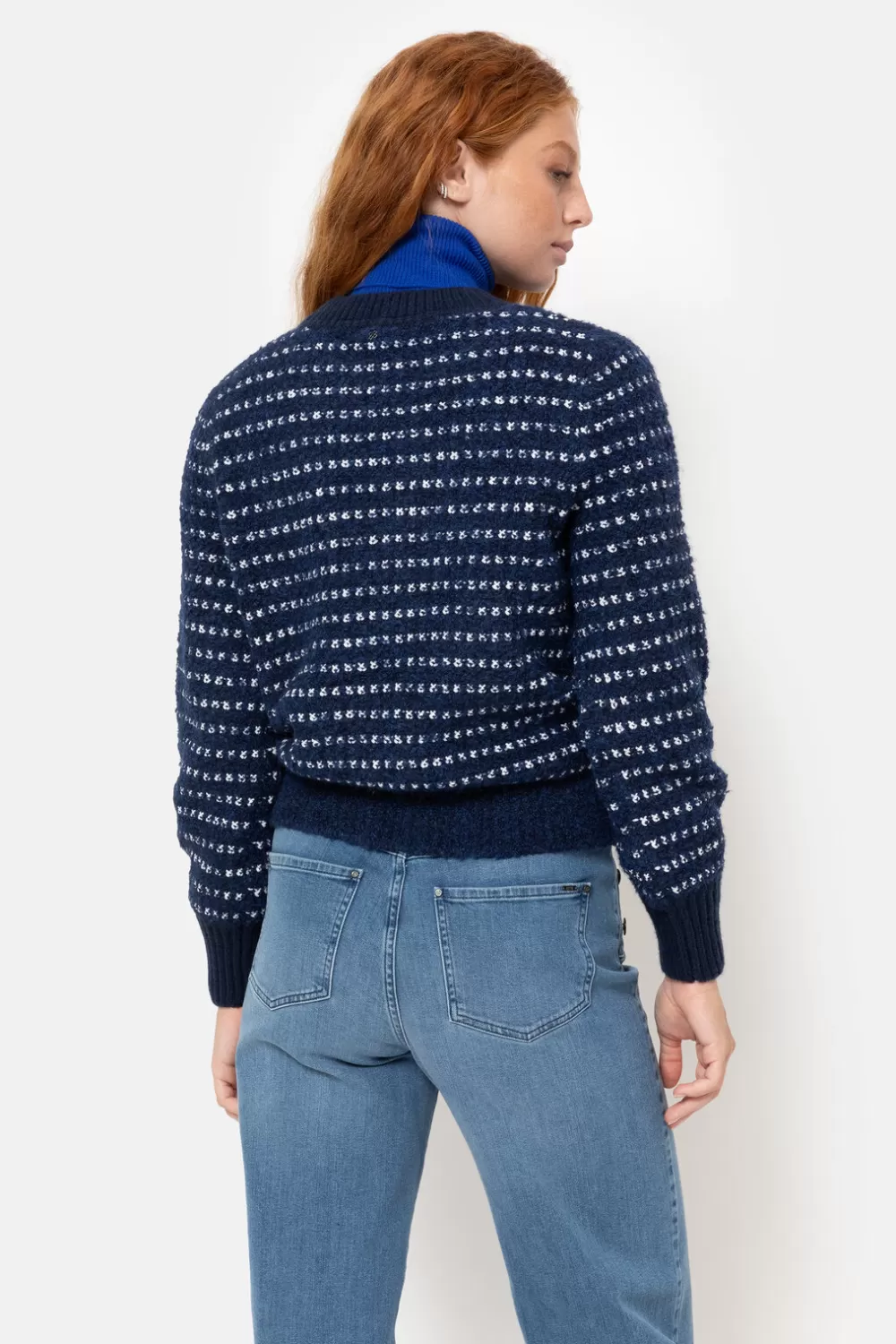 Blauwe Zeer Zacht Gebreide Dames Sweater.Met Witte Strepen En Effen Donkerblauwe Boorden.Casual En Chic Met Een Blauwe L…