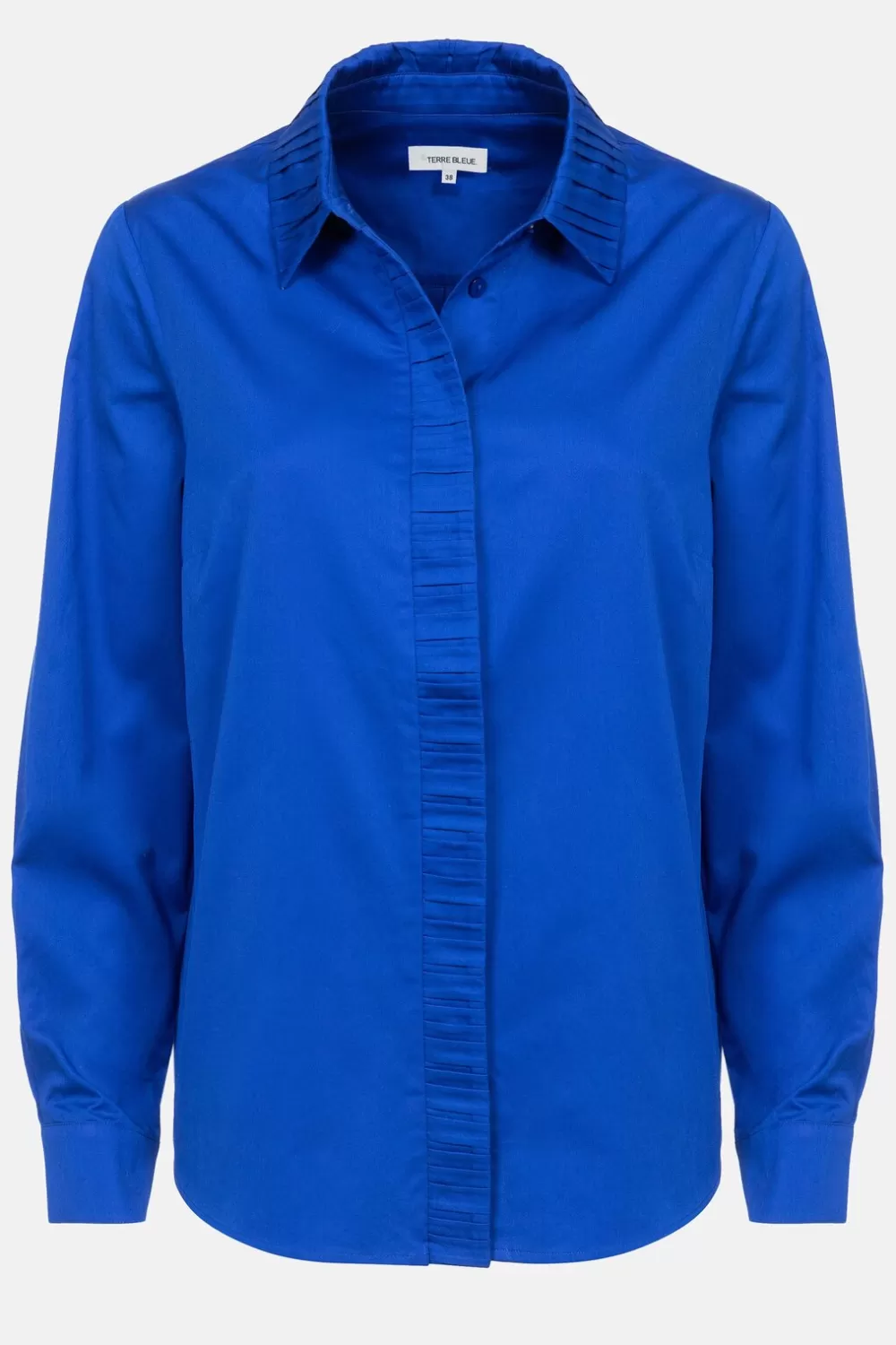 Blauwe Blouse Voor Dames, In 100% Fijn Katoen.Met Chique Vouwen In De Kraag En Middenvoor.En Lange Mouwen Met Twee Blauw…