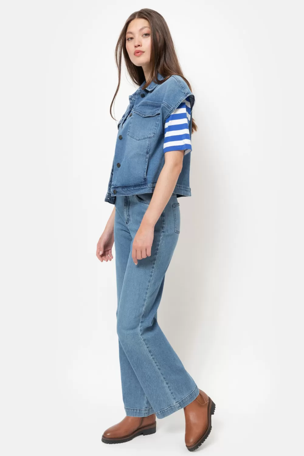 Lichtblauwe Denimbroek In Katoen Met Stretch.Een Modieuze Straight Fit Met Wijde Broekspijpen.Style Met Een Ecru Bloes, …