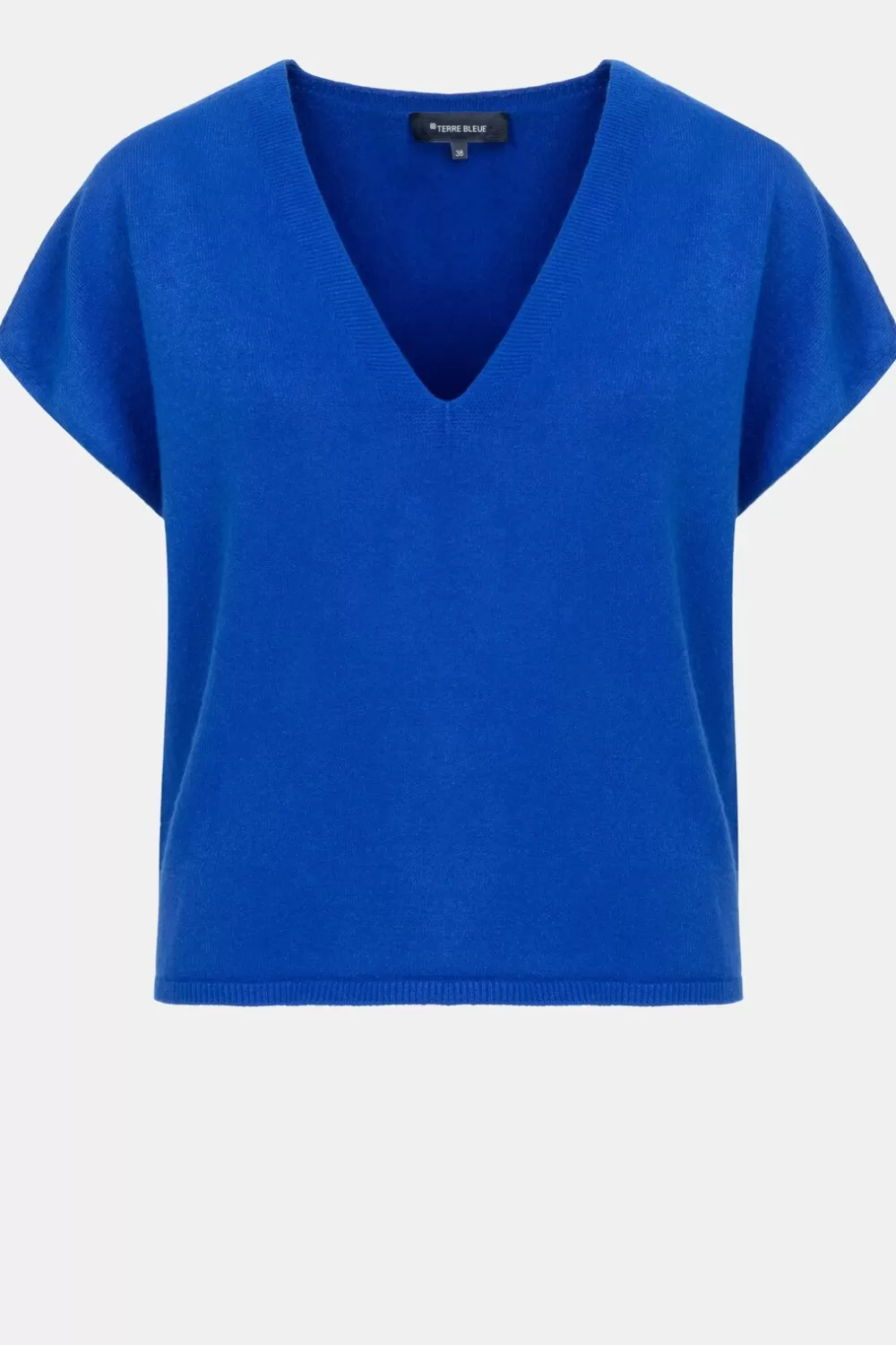 Blauwe Mouwloze Pull In Een Zachte Viscosemix.Een Boxysnit Met Kapmouwen En Een Wijde V-Hals.Casual En Chic Boven Een Br…