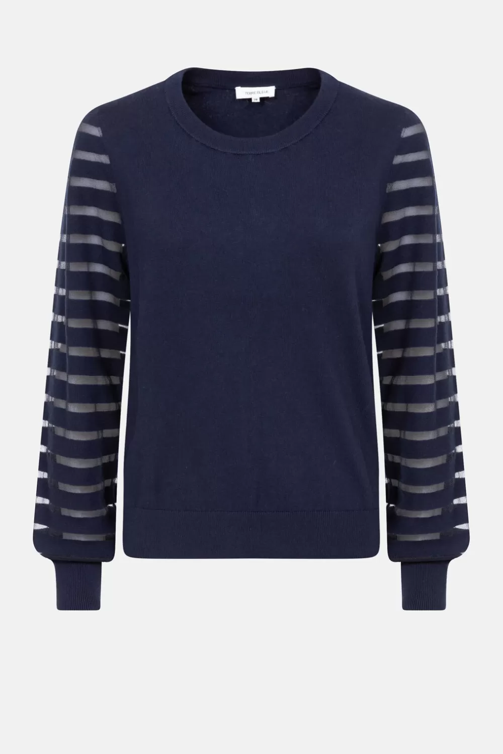 Donkerblauwe Tricot Trui In Een Fijne Katoenmix.Een Vrouwelijke Boxysnit Met Een Elegante Boothals.En Lange Pofmouwen Me…