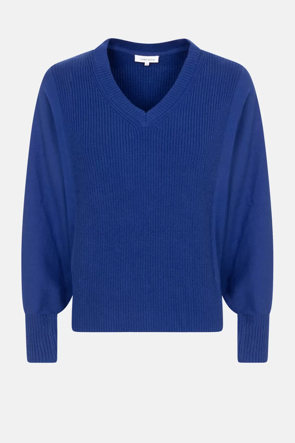 Blauwe Trui In Fijn Tricot Van O.M. Katoen.Een Elegante Snit Met V-Hals En Vleermuismouwen.Mooi Boven Een Blauw Bloesje …