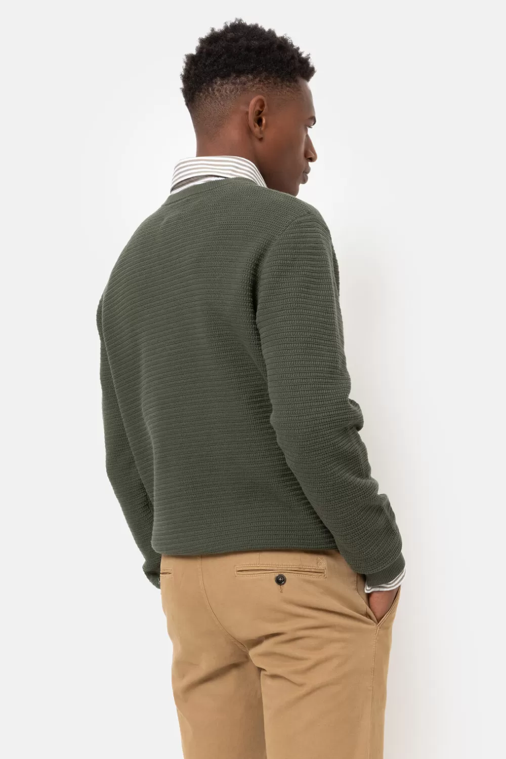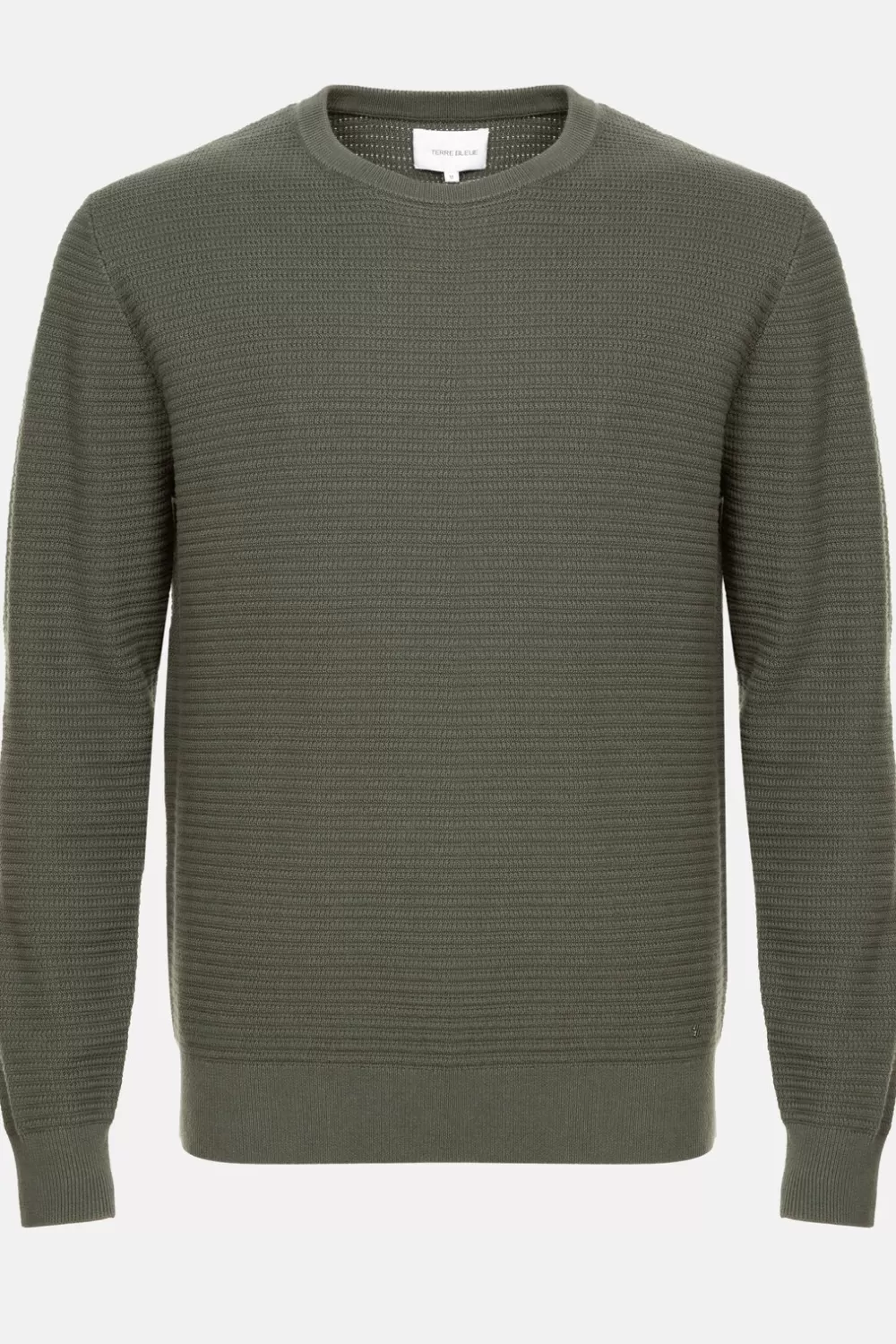 Groene Gebreide Mannentrui In 100% Katoen.Een Sportieve, Lossere Snit Met Een Elastiekboord. Een Ronde Hals En Lange Mou…