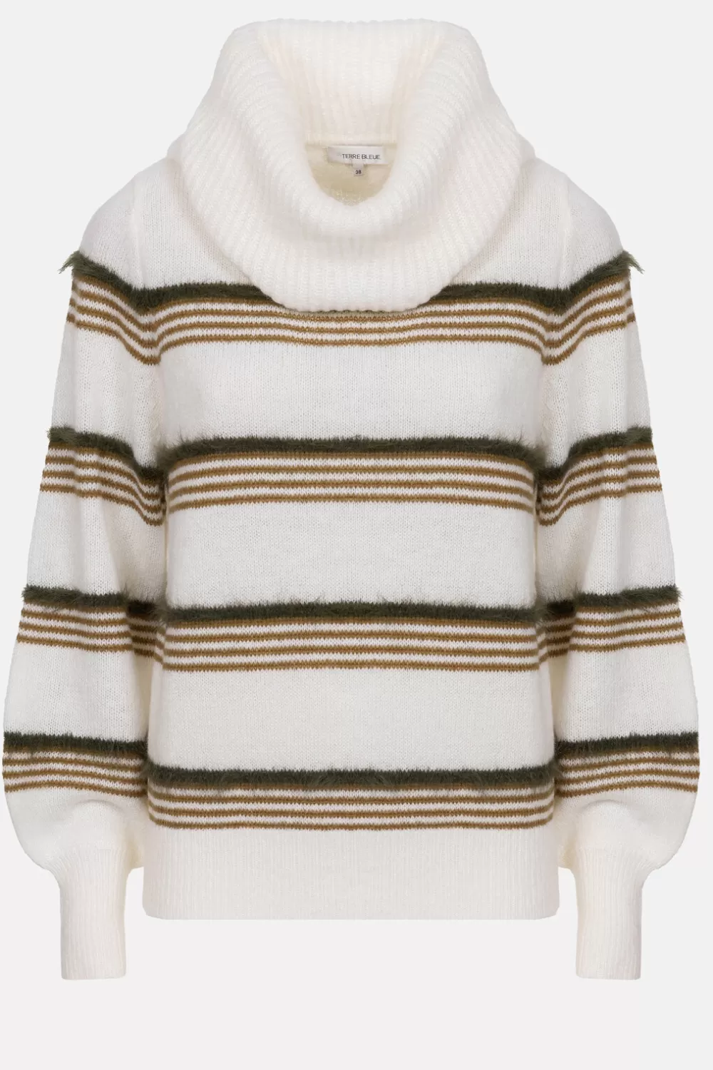 Lichtbeige Gebreide Sweater Met Groene Strepen.Een Korte Snit Met Chic Gedrapeerde Rolkraag.Draag Casual En Chic Met Een…
