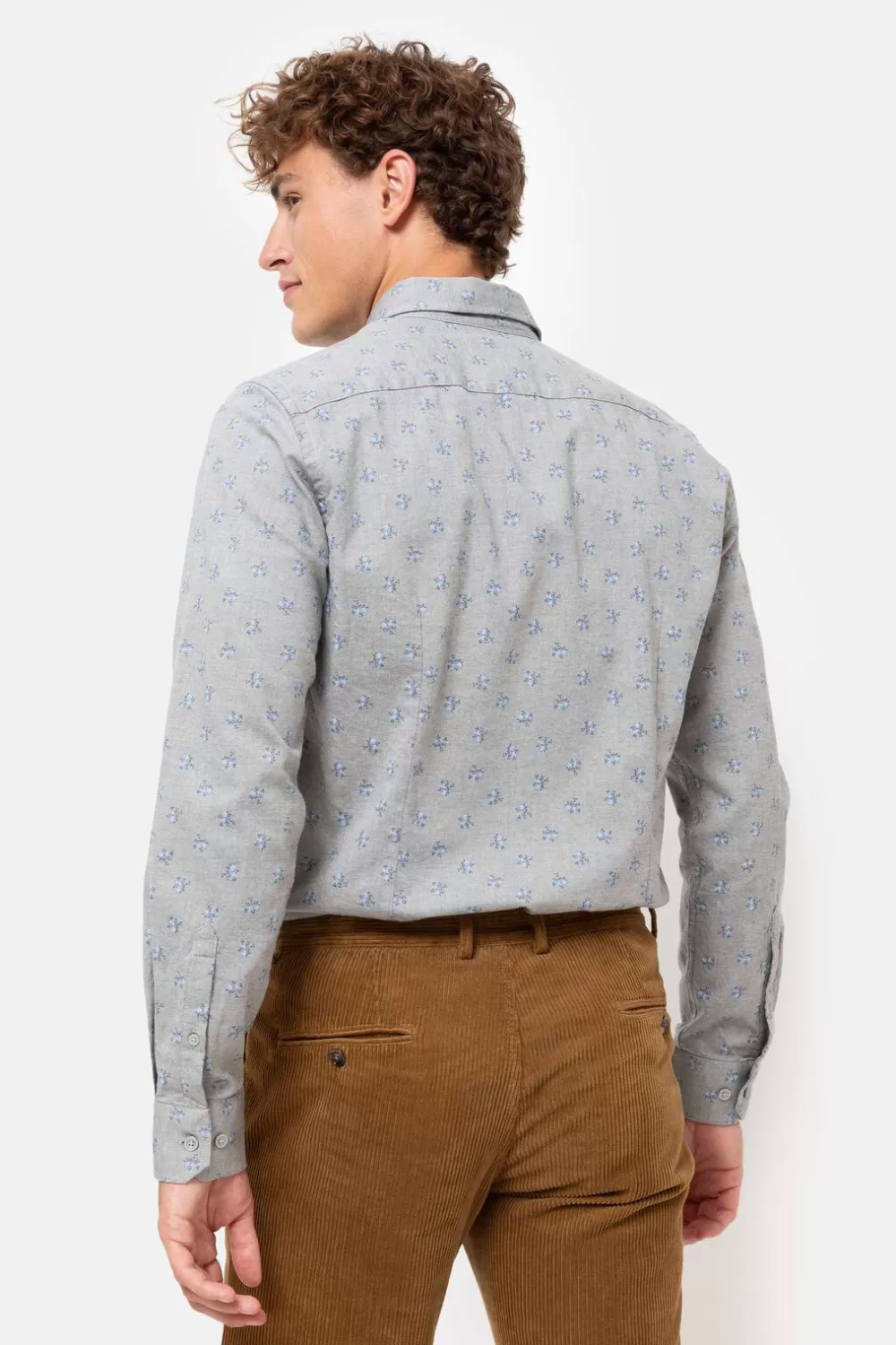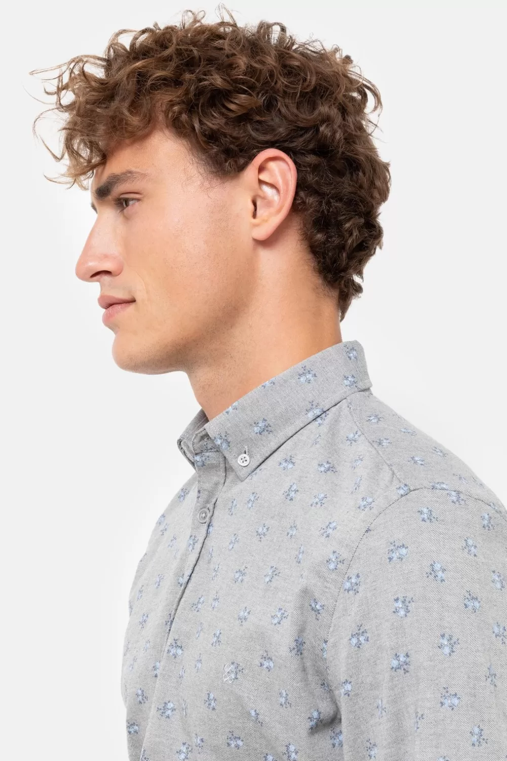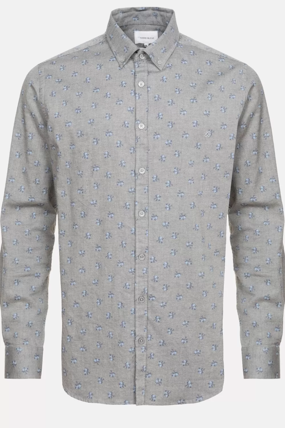 Grijs-Blauw Hemd Gemaakt Van 100% Biokatoen. Flatterende Slim Fit Met Een Microprint Van Bloemen.Met Grijze Knoopjes Aan…