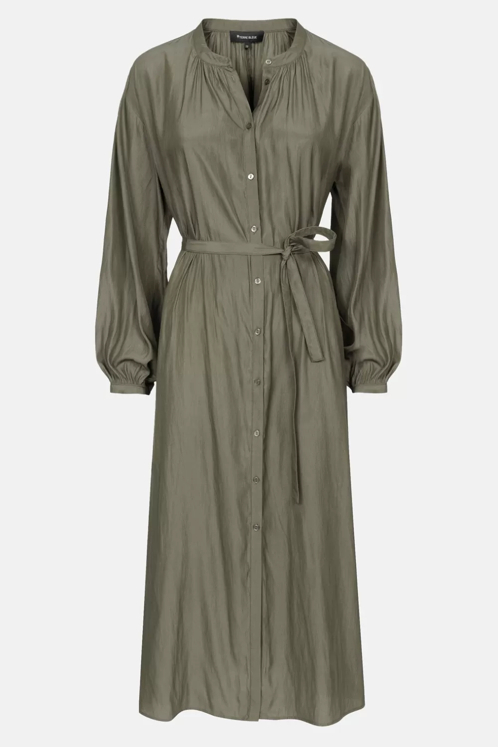 Donker Kaki Lang Kleedje In Een Fijne, Zwierige Stof.Met Kaki Knoopjes En Een Elegant Taillelint.Lange Mouwen En Een Mao…
