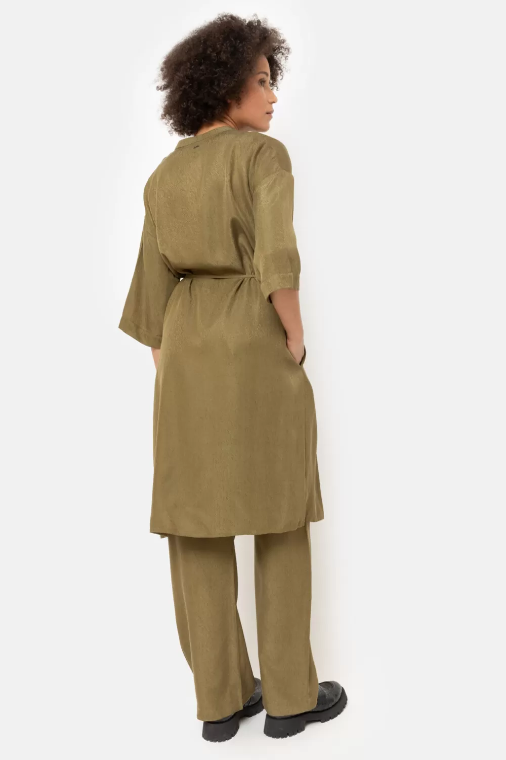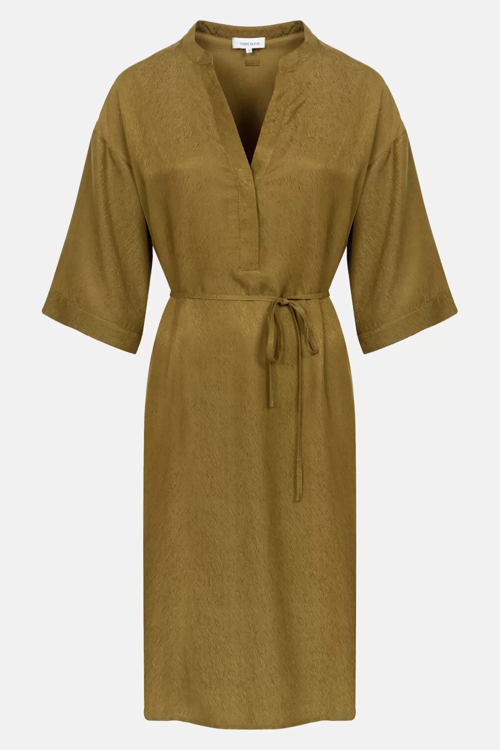 Olijfgroen Halflang Kleedje In Lyocell En Cupro.Met Heel Fijne, Glanzende Streepjes In De Stof.Een Losse, Elegante Snit …