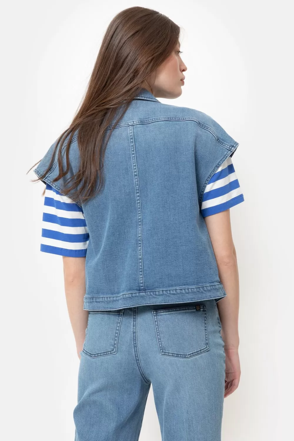 Mouwloze Korte Dames Jas In Blauw Denim.