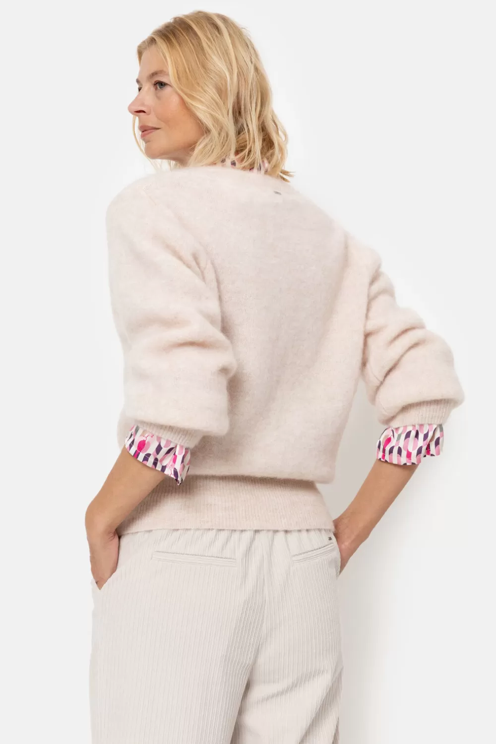 Ecru Gilet Voor Dames In Een Zachte Wolmix.Een Modieuze Boxysnit Met Lange Pofmouwen.Een Diepe V-Hals En Grote Parelmoer…