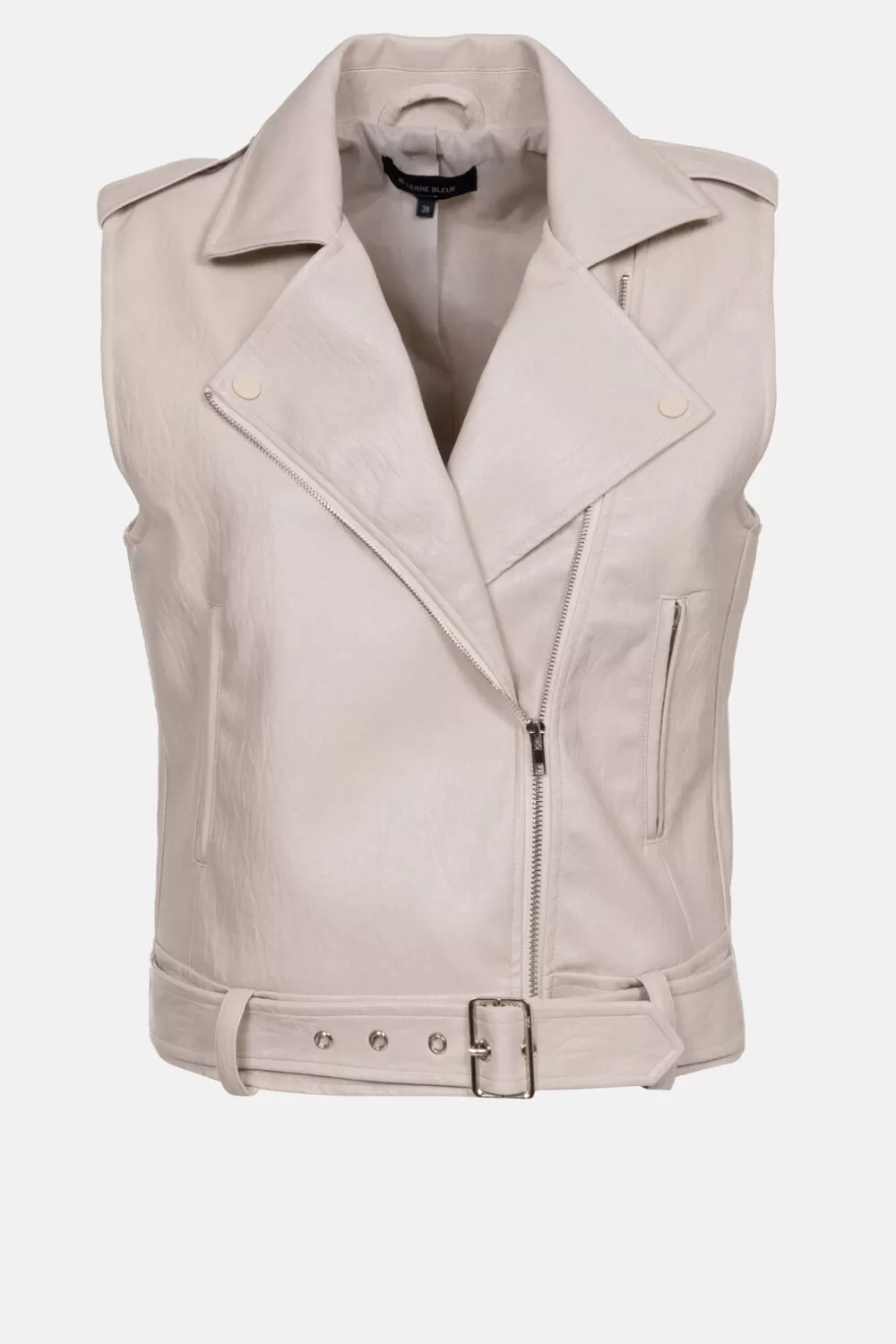 Dames Jas Zonder Mouwen In Beige Kunstleder.Korte Bikersnit Met Een Chique Ceintuur En Col Revers.Modieus Boven Een Blau…