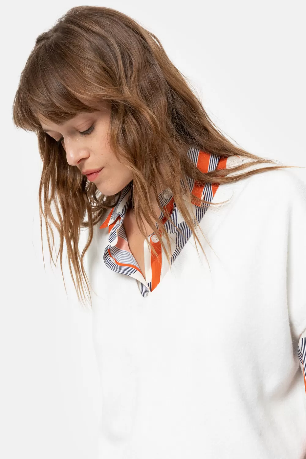 Ecru Mouwloze Pull In Een Zachte Viscosemix.Een Boxysnit Met Kapmouwen En Een Wijde V-Hals.Style Trendy Boven Een Oranje…